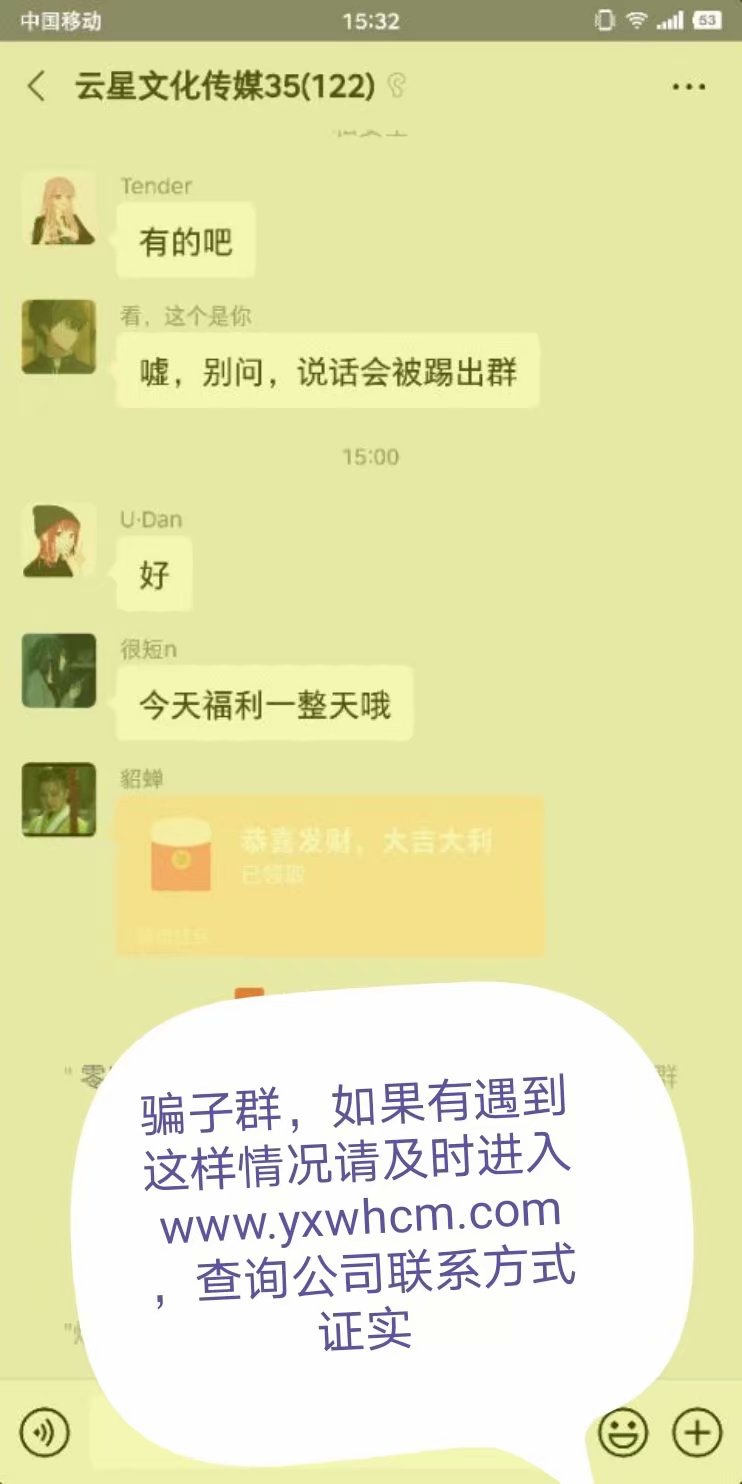 官宣:我公司【枣阳市云星文化传媒有限公司,官网 http://www.yxwhcm.com 】没有任何建群拉人给红包的活动!如果遇到此类活动上当和经济损失与本公司无关!网络太复杂、请谨慎!